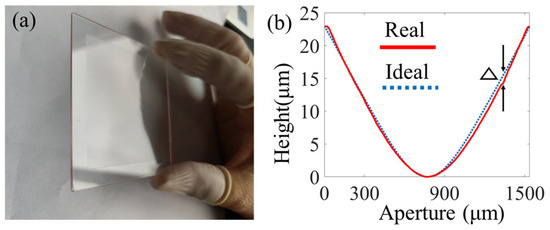 At this stage, the linear beam-shaping element designed in Section 2.1 was fabricated. Fused silica with a thickness of 1 mm was selected as the optical substrate. Based on the discussion in Section 3, detailed process parameters were determined, as shown in Table 1. The continuous-surface DOE for linear beam shaping was prepared as shown in Figure 8a. The surface profile of the actual prepared structure measured using a step profilometer (stylus profiler system, Dektak XT, Broker, Karlsruhe, Germany) was compared with the ideal profile, revealing a maximum profile mismatch of 1.1 μm (Figure 8b). The root mean square error (RMS) was 3%, which is suitable for the surface shape requirements.