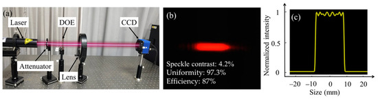 Furthermore, to verify the performance of the linear beam-shaping element, a beam-shaping experiment was carried out. The optical system is shown in Figure 9. The laser was first modulated by the DOE and the lens. The focal length, F, of the lens was 350 mm, and the CCD (HR16000CTLGEC) was placed at the focus plane of the lens to record the spot formed. The length of the linear spot collected by the CCD was 1.7 cm, which is basically consistent with the simulation results, namely, 1.728 cm, given in Section 2.1, as shown in Figure 9b. The intensity distribution was relatively uniform across the cross-section of the linear spot, as shown in Figure 9c. The speckle contrast, uniformity, and diffraction efficiency were 4.2.%, 97.3%, and 87%. In the experiment, the width of the spot formed was determined by the width of the input spot, which was 0.36 mm. Therefore, the actual spot that formed was thicker, as shown in Figure 9b, exhibiting a width consistent with that of the input spot.