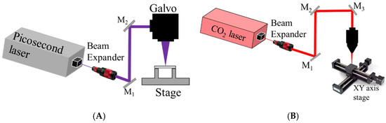 (A) Picosecond laser setup. (B) CO2 laser setup.