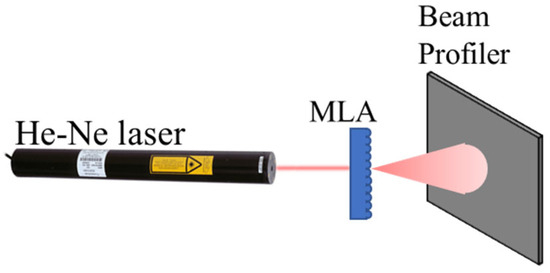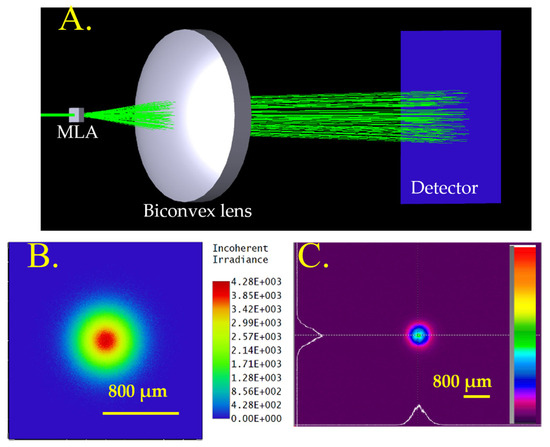 The MLAs were designed by performing modeling using Zemax software in a non-sequential mode, which provides reflection ray and transmission ray data, as shown in Figure 3A. The lens data editor was used to define different parameters such as lens material, the radius of curvature, thickness, focal length, etc. Simulation provides a beam profile and a total irradiance plot at set positions in the ray path. It also provides a focal length of MLAs, and the simulation was performed using an 800 µm size Gaussian beam with a 632 nm wavelength laser beam passing through different MLAs. Figure 3B shows the beam profile of the simulated Gaussian beam, and Figure 3C shows the X and Y-measured profile of the typical He-Ne laser beam.