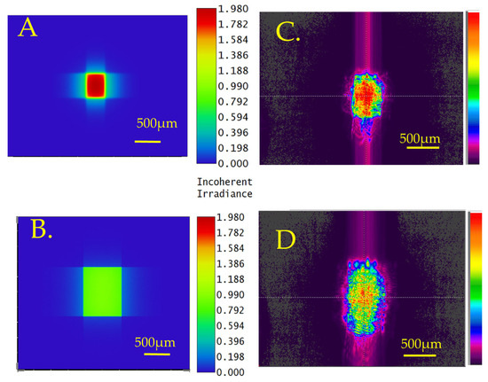 We have shown that micro concave lens arrays can be fabricated using picosecond or CO2 lasers, and convex arrays can be fabricated by first processing fused silica with a picosecond laser, followed by melting with a CO2 laser. In this section, we discuss the MLA’s optical characteristics with simulated data and the influence of microlens shape on the laser beam profile as light passes through the MLAs. Figure 5 and Figure 7 show simulated and experimentally measured beam profiles from the CO2 laser and picosecond laser-fabricated concave MLAs, respectively. The measured beam shapes at different positions agree with the simulations. In Figure 5A,B, the simulations produce a rectangular beam; this is due to the ellipticity of the laser beam during fabrication, producing an elliptical concave shape. Even with random overlapping of the concave lens, we still observe some diffraction effects as large streaks in Figure 5C,D. The picosecond laser-focused beam spot size was 25 µm, which is significantly smaller than the 300 µm spot size of the CO2 laser. The measurements on picosecond MLAs using an 800 µm laser beam, when it passes through more MLA, diffraction effects were eliminated. The concave MLA produced by the picosecond laser has a larger curvature compared to the CO2 laser process, resulting in a smaller focal length and higher divergence angles.
