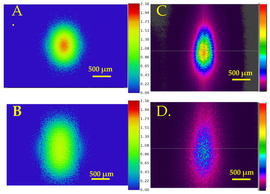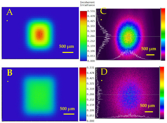 Simulated beam profile of a Gaussian beam after passing through the CO2-fabricated concave MLA at various distances from the lens: (A) 5 mm and (B) 10 mm. Experimentally measured beam profile at (C) 5 mm and (D) 10 mm.