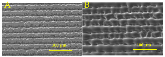 The cylindrical lens was fabricated by inscribing periodic lines with 50 µm spacing to form vertical structures using the picosecond laser, as shown in Figure 8A. The vertical structures formed by the picosecond laser were remelted to form a cylindrical lens using the CO2 laser with a power density of 25.2 kW/cm2, as shown in Figure 8B.