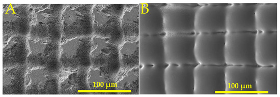 SEM image of (A) picosecond laser micromachined perpendicular line pattern and (B) convex lenses after CO2 laser melting.