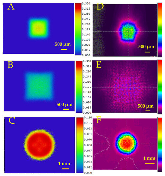 Simulated beam profile of Gaussian beam after passing through the convex MLA at various distances from the lens: (A) 5 mm, (B) 10 mm, and (C) flat-top beam profile after beam passes through MLA and through additional biconvex lens. Experimentally measured beam profile after passing through the convex MLA at various distances from the lens: (D) 5 mm, (E) 10 mm, and (F) flat-top beam profile after beam passes through MLA and through additional convex lens.