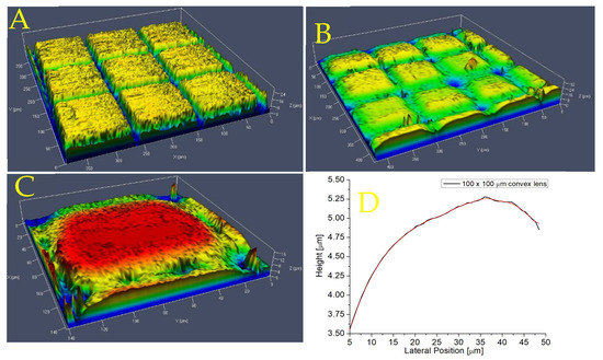 The surface roughness of the microlens was measured using confocal microscopy and AFM after the picosecond laser machining and CO2 laser melting, and the results are shown in Figure 12A,B, respectively. Figure 12C shows the surface of a single microlens. Figure 12D shows the AFM data indicating a surface roughness of 75 nm, which is comparable to other studies on the laser fabrication of microlenses.