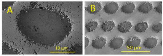 The concave MLA was fabricated using a picosecond laser. A 25 µm diameter lens was fabricated using a laser energy density of 4.66 J/cm2, as shown in Figure 6A. The lenses were spaced randomly to eliminate diffraction effects. The SEM image of these lenses is shown in Figure 6B.
