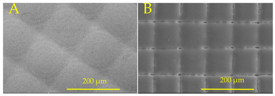 The convex lens was fabricated by inscribing a perpendicular line array using a picosecond laser to form pillar structures, as shown in Figure 10A. The spacing between lines was 50 µm. The pillar structures were remelted using a CO2 laser with a power density of 25.2 kW/cm2 to form convex lenses. The SEM image of the convex MLA is shown in Figure 10B.
