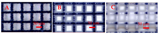 The laser parameters, such as wavelength, power, pulse width, repetition rate, the overlap between laser scan lines, and scan speed, could be used to optimize the microlens performance. The fused silica is transparent in the visible and near-infrared wavelengths, so we have used an ultraviolet laser of 355 nm wavelength for our investigations. Laser wavelengths of 1030 and 1064 nm have been reported for the fabrication of microlenses, where absorption could occur through two-photon absorption. A laser pulse width of 10 picoseconds was used for the micromachining of lines to minimize any thermal damage to the fused silica, and melting was achieved by a CW CO2 laser. In the literature, the use of femtosecond, picosecond, and nanosecond lasers for microlens fabrication has been reported, and a shorter laser pulse width minimizes heat generation. For the melt reshaping of fused silica, a CO2 laser has been the most common tool. The CO2 laser power needs to be optimized, as too low a laser power will limit the melting depth and curvature, while too high a power will cause the spreading of the melt, as shown in Figure 17. Table 2 shows the optimized parameters used in this study. After CO2 laser melting at 25.2 kW/cm2, 46 kW/cm2, and 61 kW/cm2, we measured the focal lengths of 339.6 µm, 344.91 µm, and 425.1 µm, respectively.