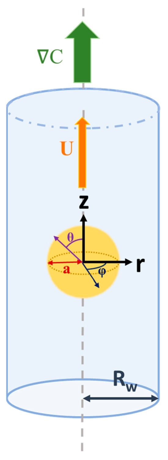 As shown in Figure 1, we consider the diffusiophoretic motion of a dielectric fluid droplet in response to a solute concentration gradient, C, along the axis of a cylindrical pore. The cylindrical pore is filled with a binary electrolyte solution, such as KCl. The droplet is filled with chargeless dielectric fluid with a uniform surface charge distribution, assuming a constant surface charge density, which remains constant with all the varying electrokinetic parameters, such as κa, where κ is the electrokinetic strength, and a is the droplet radius. This is one of the classic surface charge conditions, in addition to the constant surface potential and the charge regulation condition [,]. Spherical coordinates (r, θ, and φ) are adopted with the origin located at the center of the moving droplet for the domain inside the droplet. Cylindrical coordinates (R, Θ, and Z), on the other hand, are adopted for the domain between the droplet surface and the cylindrical pore. The droplet moves along the axis of the cylindrical pore accordingly with a constant velocity U.