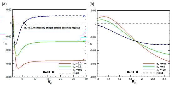 Dimensionless mobility (μ*) as a function of at various viscosity ratios σH for a dielectric droplet with σ* = 2.03 and κa = 1 in the KCl solution (β = 0): (A) small-scale; (B) large-scale.