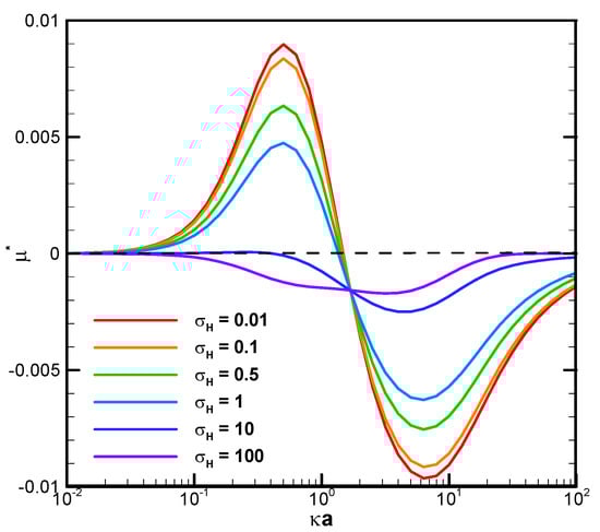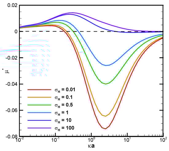 Dimensionless mobility as a function of κa with various σH for a single dielectric droplet, with σ* = 2.03 in the KCl solution (β = 0) (Reprinted from Figure 5a in Ref. []. Used with permission. © Physics of Fluids; 2021 AIP Publishing).