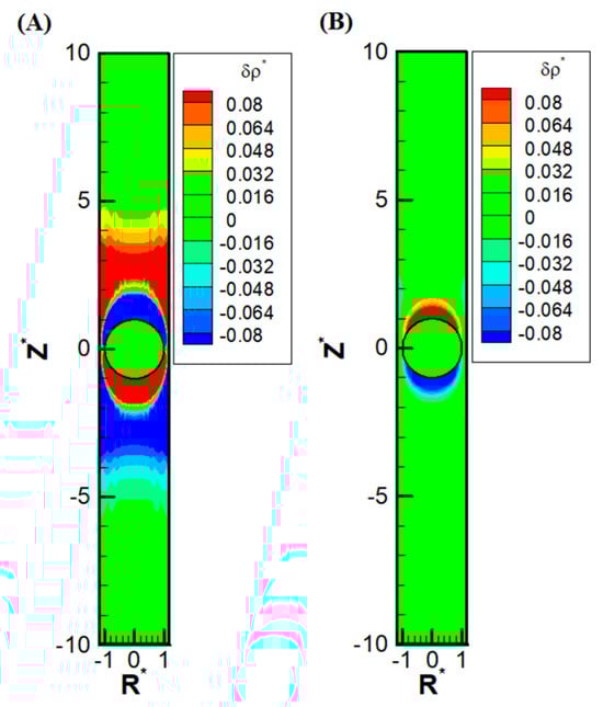 Contour plots of perturbation distribution of the dimensionless charge density (δρ*) with σ* = 2.03, σH = 0.5, κa = 1, = 1.2 in the KCl solution (β = 0): (A) diffusiophoresis; (B) electrophoresis. (R* represents the radial coordinate, Z* represents the axial coordinate, and represents the dimensionless cylinder radius).
