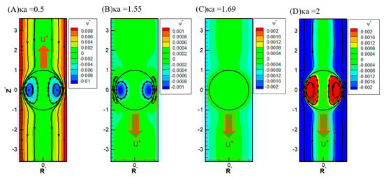 Contour plot of the stream function with σ* = 2.03, σH = 0.5, = 1.2 in the KCl solution (β = 0): (A) κa = 0.5; (B) κa = 1.55; (C) κa = 1.69; (D) κa = 2.