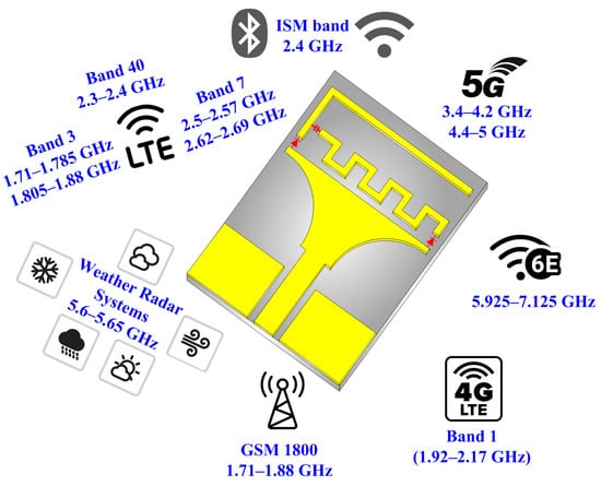 Frequency-reconfigurable antennas are a cornerstone of modern wireless communication, enabling efficient, flexible, and adaptive connectivity. Therefore, this article proposes a compact-sized antenna with multiband operation for IoT applications. The frequency-reconfiguration capability is attained by using two diodes, where four distinct operational modes are achieved. Serpentine-shaped stubs are introduced to achieve compactness. The proposed antenna supports C-band, 5G-sub-6-GHz, Wi-Max, ISM-band, GSM, and LTE applications, as depicted in Figure 1.