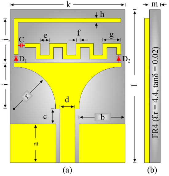 Figure 2 illustrates the design configuration of the proposed reconfigurable antenna. The antenna comprises a co-planar waveguide (CPW)-fed truncated-shaped radiator, which is further connected to an inverted L-shaped stub by means of an HPND-4005 diode D1. Another meandered line stub is also connected to the top-right edge of the radiator by using a PIN diode D2. A 100-pF surface-mounted (SMD) capacitor is placed at the node connecting both stubs to electrically separate them, so that each stub can work independently depending upon the switching state of the diode. The antenna offers a compact size of 15 × 20 mm2, whilst being easily accessible, and the cheap printed circuit-board material FR4, with a relative permittivity of 4.4 and thickness of 1.6 mm, is utilized as the substrate. The optimized dimensions of the proposed antenna and their respective values are as follow: a = 5; b = 6; c = 2; d = 2; e = 1.5; f = 0.5; g = 2.5; h = 0.5; i = 6; j = 6.4; k = 15; l = 20; m = 1.6, and r = 5.5 (unit is mm).