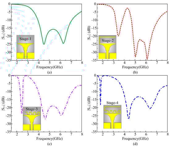 Antenna design passes through various consecutive iterations to achieve the multiband operation. For the said purpose, a truncated printed structure is selected as the base of the design, as depicted in Figure 3a. Truncated structures are well known for their broadband behavior, and the smooth transition of the shape from the rectangular feed toward the radiator allows more current to flow, which consequently improves the overall bandwidth of the antenna. The resultant antenna in stage 1 possesses the wideband ranges from 3.85 GHz to 7.37 GHz, as depicted in Figure 3a. Hereafter, the stubs are loaded to achieve multiband behavior, and efforts are made to achieve lower bands across 1.8 GHz. For this objective, initially an inverted L-shaped stub is loaded at the top-left side of the radiator, as shown in the inset of Figure 3b. The stage-2 antenna offers the dual-band response while covering the lower band ranges from 3.27 GHz to 4.02 GHz, while the upper band ranges from 4.72 to 7.29 GHz, as depicted in Figure 3b. The lower band is the result of loading the stub, whereas the effective length of the stub to achieve the lower band is calculated by using the following expression provided in [35,36]: