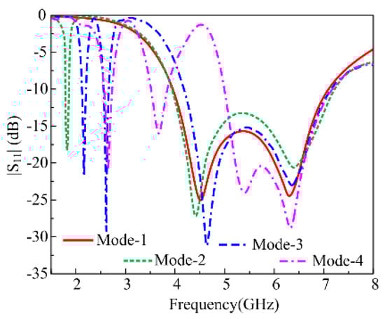It is clear from the multiband antenna design stages that the two stubs and their unique combination can generate an additional lower stub while maintaining the wideband behavior of the radiator. Therefore, two PIN diodes are utilized to electrically connect and disconnect the stubs depending upon the user requirement. However, the diode can be triggered on or off simultaneously due to a physical connection, which is result of the stage-4 design. This arising problem is resolved by adding an additional capacitor at the junction of the stubs, as shown in Figure 2. The additional capacitor as well as the RLC load introduced by the addition of the diodes results in increased mismatching along with the shift in the lower frequency. Thus, optimization is performed by using a parametric analysis and the fine-tuned reconfigurable antenna offers four operational modes, as shown in Figure 4.