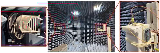 Figure 6 depicts the antenna under test conditions for far-field parameters. The antenna is tested inside the electromagnetic anechoic chamber, where the whole biasing network is also connected with the antenna to obtain the real-scenario results, as depicted in Figure 6. All measurements are carried out at Korea Radio Promotion Association (RAPA) internet-of-things (IoT) technical support center. In the forthcoming section, the performance parameters of each mode are presented to understand the behavior of the antenna for various switching states.
