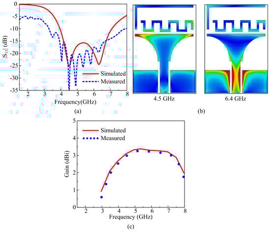 In mode 1, when both diodes are in the off state, that corresponds to the working of the lower part of the radiator while the stubs do not play any role in the radiation. The proposed antenna offers a wideband mode, having an S11 < −10 dB simulated impedance bandwidth of 3.9–7.15 GHz, while the measured results offer 3.2–8 GHz, as depicted in Figure 7a. The measured bandwidth is wider as compared to the simulated results, which is due to the presence of the biasing cables that consequently induce additional coupling and affect the performance of antenna. To understand the working behavior of the antenna for mode 1, the surface current graphs at 4.5 GHz and 6.4 GHz are presented, as shown in Figure 7b. At both frequencies, the maximum current flows across the lower part of the radiator and CPW feed. Moreover, due to the close presence of the upper part of the radiator, i.e., stubs, a small amount of current is also induced in them; however, the performance remains unaffected as compared to the antenna without any diodes. Lastly, the gain over the operational wideband is also presented in Figure 7c, and the antenna offered a gain of more than 2.5 dBi, while the measured results also offered the strong comparison as compared with the simulated results. This wideband mode targeted the frequency band spectrum globally that was allocated for C-band applications along with coverage of the sub-band, but this was not limited to Wi-Fi, the ISM upper band, Wi-Fi 6E, and the weather radar system.