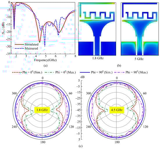 In mode 2, corresponding to D1 being in the off state while D2 is in the on state, the antenna system offers a dual-band operational mode. Besides the wideband generated in mode 1, the antenna offers a low band across 1.8 GHz. The results offer corresponding simulated and measured values of 1.78–1.84 GHz and 1.77–1.87 GHz across the lower resonance. Meanwhile, at a higher resonance, the bandwidth of 3.91–7.23 GHz is observed for the simulated case, while the measured value ranges from 4.17 GHz to 7.13 GHz, as depicted in Figure 8a. The operational behavior can be understood by using the surface current graphs, where at a lower resonance of 1.8 GHz the maximum current is observed across the inner stub and upper part of the main radiator; moreover, a handsome amount of current is also induced in the outer stub as well, as depicted in Figure 8b As is depicted for mode 1, the higher bands are generated due to the main radiator and this is also validated by analyzing the surface current graph at 5 GHz.