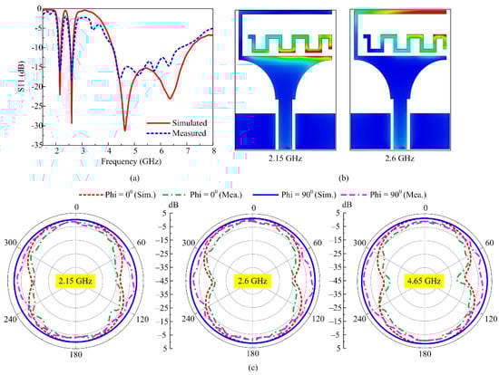 In mode 3, when D1 is switched on while keeping D2 switched off, the antenna offers the tri-band behavior with wideband behavior similar to mode 1, and two distinguished resonances across 2.15 GHz and 2.6 GHz, as depicted in Figure 9a. Simulated results offer the impedance bandwidths of 2.1–2.19 GHz, 2.54–2.65 GHz, and 4.2–7.2 GHz, which correspond to 4.18%, 4.23%, and 64.5%, respectively. On the other hand, the measured result offers an S11 < −10 dB bandwidth of 2.09–2.21 GHz, 2.55–2.69 GHz, and 4.25–6.87 GHz, as depicted in Figure 9a. The surface current distribution is also studied, where at 2.6 GHz, the maximum current is concentrated in the outer stub, while a small amount of current is also induced in the inner stub. Contrary to that, at 2.15 GHz, the maximum current is observed in the inner stub, which is due to coupling among the stub and the radiator, as depicted in Figure 9b. Since the inner stub offers the bigger electric length, the coupling generates a lower frequency of 2.15 GHz, unlike the generation of 2.6 GHz due to the outer stub, which offers the smaller electrical length.