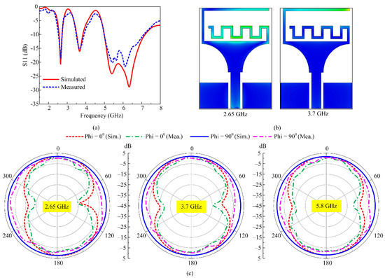 Mode 4 corresponds to both diodes being in the on state. In this mode, the antenna offers a tri-band mode, where the simulated results show the S11 as being less than −10 dB with impedance bandwidth ranges of 2.55–2.72 GHz, 3.5–3.85 GHz, and 4.99–7.15 GHz, as shown in Figure 10a. The measured results also offer the tri-band mode, where the two narrow bands are observed across the resonance of 2.65 GHz and 3.7 GHz with respective bandwidths of 2.51–2.7 GHz and 3.47–3.9 GHz. On the other hand, the wideband ranges from 5.05 GHz to 7 GHz, as depicted in Figure 10a. The current distribution graphs are also presented for both lower band resonances of 2.65 GHz and 3.7 GHz, as shown in Figure 10b. It is clear from the current distribution analysis that the middle band of 3.7 GHz is generated due to the inverted L-shaped stub, as most of the current is observed across it. Meanwhile, the lower resonance of 2.65 GHz is due to the inner meandered line stub, which corresponds to a larger electrical size, as depicted in Figure 10b.