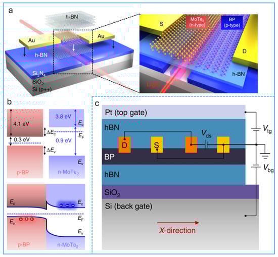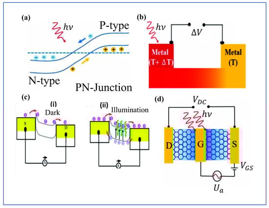 A fundamental mechanism is the photovoltaic effect, which occurs when photogenerated electron–hole pairs are separated by an internal electric field, typically present at p–n junctions or heterostructure interfaces [18]. Alternatively, an external electric field, induced by applying a bias voltage between the source and drain, can also drive this effect. However, this approach is less desirable as it introduces dark current, as illustrated in Figure 1a [19]. This built-in field, arising from work function differences or local chemical doping, drives charge carriers in opposite directions, generating a photocurrent without the need for an external bias [20]. In particular, the direction of current depends on the type of junction (pn vs. np), and the process benefits from carrier multiplication effects that improve quantum efficiency [21].