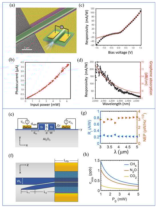 In a related advancement, Mohammed Alaloul and colleagues proposed a mid-wave infrared (MWIR) graphene photodetector integrated with silicon-on-sapphire slot waveguides, optimized for on-chip gas sensing through absorption spectroscopy (Figure 2e,f). The device capitalizes on the strong interaction between the optical mode and analyte gases in the slotted air region of the waveguide, which is crucial for high-sensitivity detection. The authors evaluated the device by analyzing its current responsivity (Ri) and detection capabilities for trace gases such as carbon dioxide (CO2), methane (CH4), and nitrous oxide (N2O). As shown in Figure 2g, the Ri across the MWIR band remained relatively uniform, ranging between 0.21 and 0.26 A/W. Minor fluctuations in the Ri were attributed to variations in coupling efficiency and wavelength-dependent absorption by graphene in the waveguide-integrated setup. The obtained responsivity is much greater than previously reported MIR graphene-based photodetectors [29,37,38], which is critical to enhance the sensitivity of the device in detecting low concentrations of target gases. Impressively, the system demonstrated the ability to detect minimum concentrations () as low as 0.14 parts per billion (ppb) for CO2, 0.52 ppb for N2O, and 0.72 ppb for CH4 under a source power of 2 mW (Figure 2h) [9].