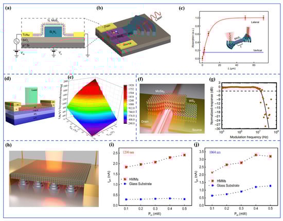 TMDC photodetectors. (a) Schematic of a MoS2-based photodetector integrated into a photonic circuit, where monolayer MoS2 is directly exfoliated onto the waveguide. (b) Illustration of light coupling achieved by focusing a 647 nm continuous-wave (CW) laser onto the diffraction grating. The light propagates through the Si3N4 waveguide and generates electron–hole pairs in MoS2, leading to photocurrent generation in the biased monolayer. (c) Influence of the MoS2 monolayer and metal contacts on waveguide light propagation. Experimental data compare lateral and vertical absorption as a function of flake length [41]. (d) Schematic showing gate and source–drain bias modulation of the photodetection performance in a vertically stacked 2H-MoS2/1T@2H-MoS2 device. (e) A 3D view of the photoresponsivity mapping of this device under varying gate and source–drain biases, measured at an illumination power density of 2.35 mW/cm2 [42]. (f) Schematic of a MoSe2–WS2 heterostructure photodetector transferred onto a silicon nitride waveguide. (g) Frequency response of the photodetector with modulation frequency of incident light is swept, revealing a dB cutoff at ∼20 MHz. The solid line fits an RC low-pass filter model [43]. (h) Schematic of a hyperbolic metamaterial (HMM) nanocavity integrated with a 2D TMDC layer. (i,j) Photocurrent as a function of incident power at resonance (1200 nm) and off-resonance (1064 nm), respectively. A ∼7.5-fold enhancement is observed at ∼0.3 mW for on-resonance excitation, while the off-resonance case shows ∼2.5-fold enhancement at similar power levels [44].