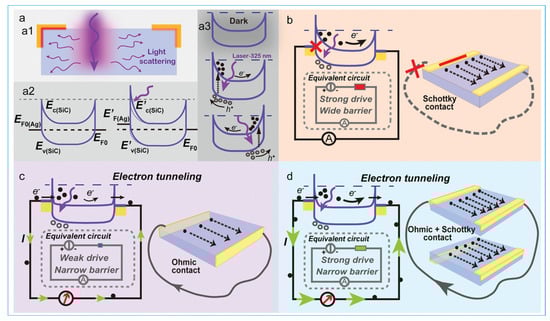 Working mechanism of the self−powered 4H−SiC PD. (a) Energy band variation of “Schottky + Ohmic” contact under different illumination conditions. (a1) Diagram of laser scattering in SiC crystal; (a2) schematic diagram of energy band change after illumination; (a3) schematic diagram of energy band changes corresponding to illumination at different positions. (b−d) The energy band changes of the self−powered 4H−SiC PD and equivalent schematics under Schottky contact (b), Ohmic contact (c), and “Schottky + Ohmic” contact (d), respectively [85].