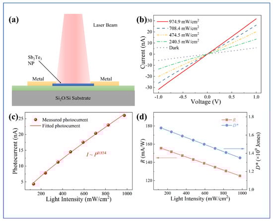 (a) Schematic illustration of the photodetection setup, where a laser beam irradiates the Sb2Te3 nanoparticle (NP)−based photodetector fabricated on a SiO2/Si substrate with metal electrodes. (b) Curren–voltage (I–V) characteristics of the device under 850 nm light illumination at various optical power densities (974.9, 708.4, 474.5, and 240.5 mW/cm2), along with the dark condition, measured at room temperature with a 1 V bias. (c) Photocurrent as a function of incident light intensity, showing a power-law dependence, indicating the nonlinear photoresponse behavior. (d) Responsivity (R) and specific detectivity (D*) of the device as a function of light intensity, both showing a decreasing trend with increasing power density. All measurements were performed at room temperature under a constant bias of 1 V [100].