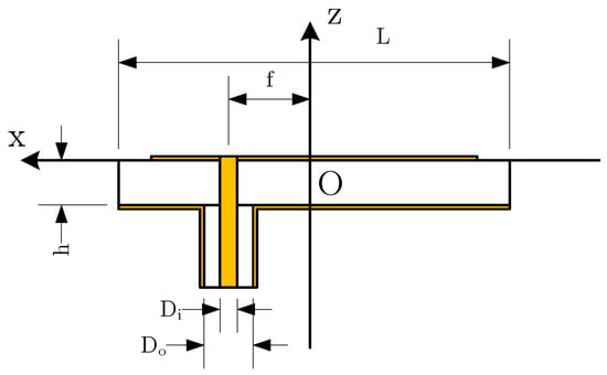 The polygon patch antenna designed in this study incorporates a dielectric substrate with a thickness of , chosen for its manufacturability and suitability for practical applications in advanced antenna designs. The antenna is excited through a coaxial feed line, as shown in Figure 1. This feed line is designed with a characteristic impedance of , featuring an inner diameter () of and an outer diameter () of . The dielectric medium inside the coaxial line is a vacuum, with a relative permittivity of 1.0. To minimize the impact of the exposed section of the feed line on the overall performance of the antenna, its length is fixed at in the simulation model. Figure 1 illustrates the sectional view of the antenna along the plane. The upper and lower copper foils, which constitute the patch and ground plane, are modeled with an exaggerated thickness for clarity, although their actual thickness is .