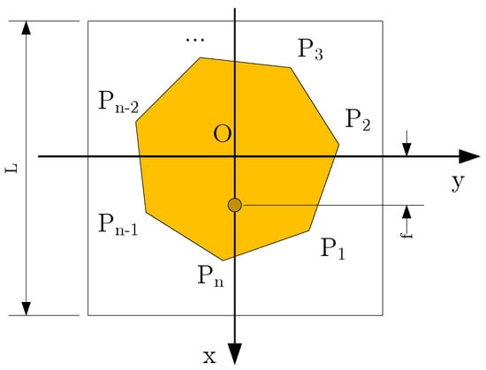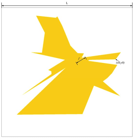 The top view of the antenna is depicted in Figure 2, showing the polygonal patch structure placed on a square dielectric substrate. The center of the square substrate coincides with the origin O, and the position of the feed probe lies in the plane. The maximum side length of the patch, denoted as L, and the base plate are designed as a fully conductive surface. The distance from the center of the feed probe to the z-axis is denoted as f. The polygon patch lies entirely within the plane, with its vertices denoted in counterclockwise order as , and their arguments are defined as shown in Equation (1). The coordinates of these vertices are expressed as , and their corresponding angular positions are .