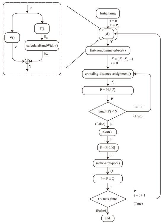 To overcome these limitations, this paper presents a framework that integrates evolutionary optimization with full-wave simulation tools. Specifically, we embed the improved NSGA-II algorithm within a co-simulation environment powered by the High-Frequency Structural Simulator (HFSS) [26,27]. The improved NSGA-II algorithm retains the strengths of the original framework, while featuring a dynamically adaptive mechanism that adjusts crossover and mutation rates according to the evolutionary stage [28], and incorporates an acceptance criterion inspired by simulated annealing during offspring generation [29,30]. These improvements are specifically designed to accelerate convergence, maintain solution diversity, and enhance the quality and stability of the Pareto front, thereby overcoming the limitations of NSGA-II in complex, high-dimensional multi-objective optimization scenarios.