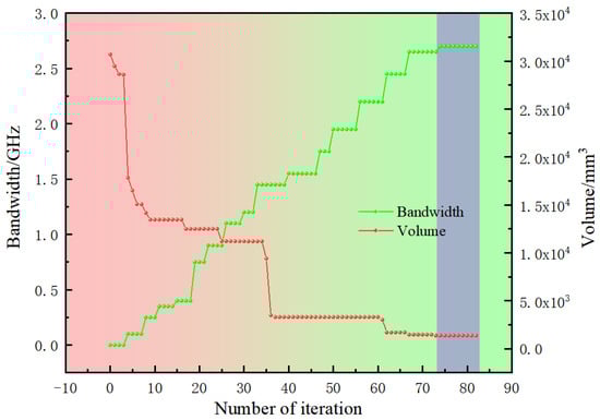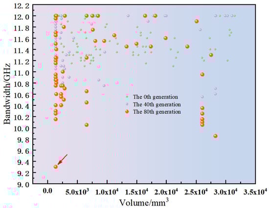 Simulations were conducted using the parameter settings outlined and the adaptive optimization algorithm. The optimization process was carried out over 80 generations, evaluating a total of 6698 individual antenna designs. Each simulation required an average of two minutes per individual, leading to a cumulative computation time of approximately one week. The computations were performed on a high-performance computing system equipped with dual Intel Xeon Gold 6140 processors and 128 GB of RAM. Figure 4 depicts the optimization trajectory, emphasizing antenna volume and bandwidth as critical performance metrics. These metrics were employed to evaluate the convergence of the optimization algorithm. The optimization process was monitored across multiple generations, and the results indicate that significant improvements in the Pareto front ceased beyond the 70th generation, indicating the algorithm had effectively converged to optimal solutions by this stage.