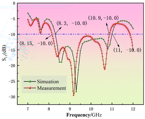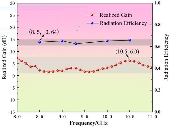Figure 9 presents both the simulated and measured S11 parameters of the antenna, illustrating consistent trends between simulation and experimental results. The blue dotted line is the −10 db line. The simulated operating band spans from 8.3 GHz to 11 GHz with an absolute bandwidth of 2.7 GHz, while the measured operating band spans from 8.15 GHz to 10.9 GHz with an absolute bandwidth of 2.75 GHz. The relative bandwidths are 28% and 28.9%, respectively. This validation demonstrates the efficacy of the proposed optimization algorithm in designing antennas with enhanced performance metrics suitable for applications requiring broad frequency coverage. Figure 10 illustrates the simulated variations in gain and radiation efficiency of the antenna across the specified frequency range. The gain exhibits a consistent trend within the operational bandwidth, reaching a peak value of 6 dB at 10.5 GHz. Concurrently, the radiation efficiency maintains a high performance, averaging approximately 0.64 throughout the frequency band.