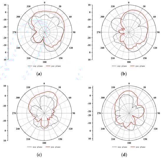 Simulated radiation patterns of the irregular polygon patch antenna. (a) Radiation patterns of 8.5 GHz. (b) Radiation patterns of 9 GHz. (c) Radiation patterns of 10 GHz. (d) Radiation patterns of 10.5 GHz.