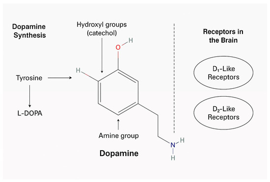 Dopamine is a crucial catecholamine neurotransmitter (Figure 1) that plays multifaceted roles in the central nervous system, modulating motor control, motivation, cognition, and reward-based behavior [1]. Its function in the mesolimbic and mesocortical pathways underpins emotional processing and executive functions, with alterations in dopaminergic signaling contributing to the pathophysiology of several psychiatric disorders, including schizophrenia, bipolar disorder, depression, and attention-deficit hyperactivity disorder (ADHD) [2,3].