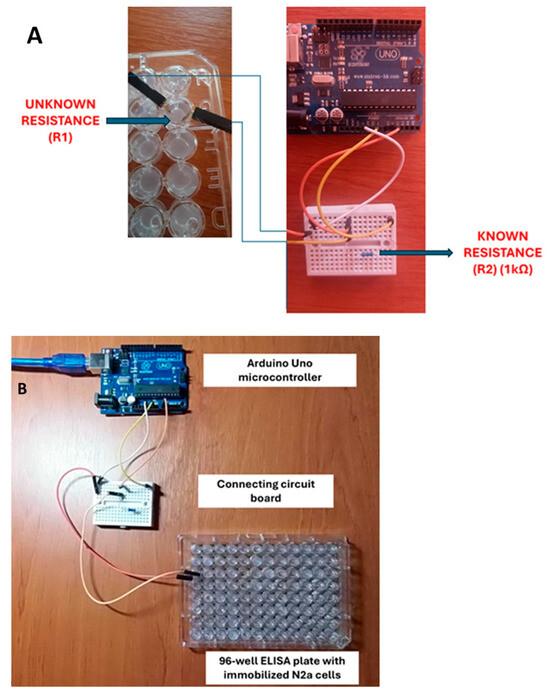 (A) Actual set-up of the variable resistance meter circuit based on an Arduino Uno microcontroller. The unknown, variable resistance (R1) is represented by the gel-immobilized cell system in the microwell (left) where measuring electrodes (made of Ag/AgCl) were inserted into the sides exactly opposite each well to measure the ohmic resistance. A 1 kΩ (kOhm) resistor was used as the constant, known resistance (R2). (B) Presentation of the complete biosensor based on an Arduino Uno microcontroller, the circuit board, and the ELISA plate containing immobilized neuroblastoma cells.