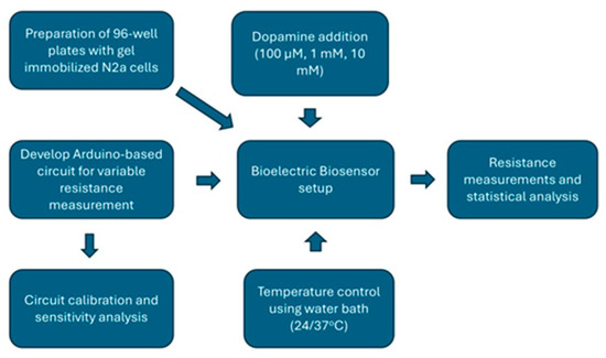 The purpose of the present study was to conduct a preliminary investigation into the ability of a bespoke Arduino platform to monitor neural cell responses using dopamine as a model neurotransmitter. Cells were gel-immobilized in order both to provide them with a physicochemical medium which resembled their natural in vivo environment to a degree while at the same time maintaining their viability during the experimental period, and to facilitate measurements in a user-friendly, scalable way. In this respect, our research plan did not include an exhaustive range of dopamine concentrations or a detailed study of dopamine–cell interactions (e.g., by using dopamine antagonists), and only the proof-of-concept applicability of the Arduino platform in this field was assessed. That said, our work could be considered as a continuation of our previous research [13] on the bioelectric response of N2a cells to the 0–1000 μΜ range of dopamine (with an established limit of detection at 1 nM).