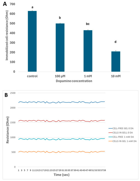 (A) Changes in immobilized N2a cell resistance in response to different dopamine concentrations at 24 °C. Columns indicated by different letters represent statistically different results at p < 0.0001 (n = 384 for each dopamine concentration) (values are normalized after subtracting cell-free gel responses from respective immobilized-cell responses at each dopamine concentration) (B) Actual traces (resistance time series) of cell-free and cell-containing gels against zero (control) and 1 mM dopamine concentrations.