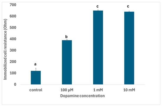 Changes in immobilized N2a cell resistance in response to different dopamine concentrations at 37 °C. Columns indicated by different letters represent statistically different results at p < 0.01 (n = 384 for each dopamine concentration).