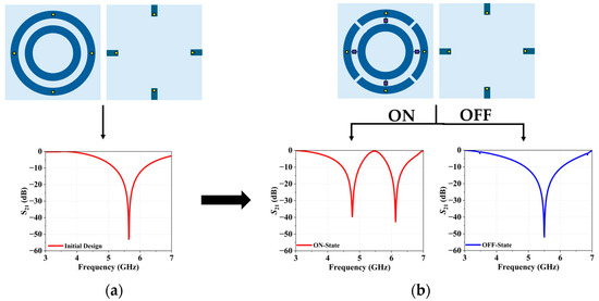 Figure 1 illustrates the unit cell of the R-FSS. The preliminary unit cell design given in Figure 1a consists of two closed circular ring elements, where the outer rings of the R-FSS are connected to each other through vias and connection lines. With this structure, the dual-band characteristic that attenuates the signals in the 1.81–2.19 GHz and 4.91–6.03 GHz frequency bands while allowing other microwave signals to transmit effectively is achieved. As reported in the literature, bringing these rings closer induces coupling effects, merging the dual resonances into a single, broader frequency band. As shown in Figure 1b, the electrical connection between the rings is dynamically controlled using PIN-diodes, enabling reconfigurable switching between narrowband and wideband frequency characteristics. To facilitate proper biasing of the PIN-diodes, rectangular patches are integrated on the backside of the substrate, connecting to the outer ring through vias. Each unit cell incorporates a total of four PIN-diodes, arranged in pairs oriented horizontally and vertically. Small notches are etched onto the outer ring to prevent short circuits during diode biasing, ensuring synchronized switching of diodes in either the ON or OFF states along the horizontal or vertical axes.