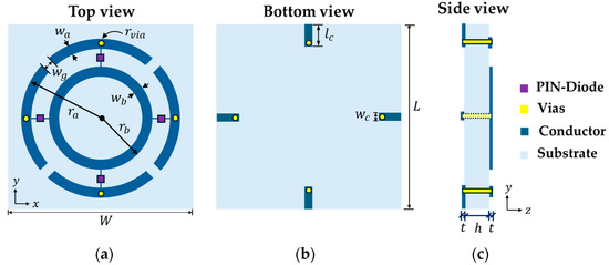 Figure 2 illustrates the design parameters of the proposed R-FSS, with the purple rectangles representing the PIN-diodes and the yellow circles indicating the vias. The electrical connection from the outer ring to the bottom layer is provided by vias with radius , shown in yellow. The top layer consists of two concentric rings with radii and , and corresponding patch widths and .