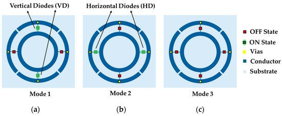 Here, denotes the total number of diodes, which is equal to 8 for vertically oriented diodes and 12 for horizontally oriented diodes. In Mode 1, only the vertical diodes are ON (9 V is applied to the vertical diodes). Mode 2 is achieved by turning the horizontal diodes ON (9 V is applied to the horizontal diodes). In Mode 3, all diodes are OFF. The schematic representation of the biasing diagram of the R-FSS is given in Figure 9.