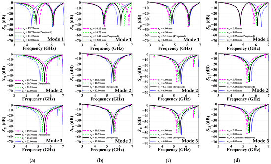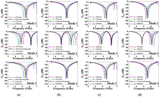 The effects of the design parameters on the stop and pass band characteristics are investigated by a parametric analysis. Figure 4 and Figure 5 present the transmission coefficient variation in the proposed R-FSS unit cell, alongside their optimum results, for the key design parameters: (a) , (b) , (c) (outer circle width) and (d) (inner circle width) for TE and TM modes, respectively. Figure 4a and Figure 5a analyze the effect of varying on under TE and TM polarizations, respectively, with results shown for Modes 1, 2, and 3. As increases, the associated inductance rises, resulting in a downward shift in the resonant frequency. In dual-band responses, this trend is more prominent in the first resonance, where the frequency decreases consistently with increasing . Similarly, Figure 4b and Figure 5b analyze the effect of varying on the transmission coefficient for TE and TM polarizations, respectively. Since corresponds to the inner ring radius, its variation predominantly affects the second resonance in dual-band responses. As illustrated in Figure 4c and Figure 5c, an increase in leads to a shift in the resonant frequency toward higher values. Similarly, increasing the width of the inner ring in resonators leads to an upward shift in the resonant frequency, as shown in Figure 4d and Figure 5d.