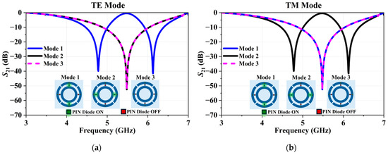 As illustrated in Figure 3, two diodes are placed vertically and two horizontally between the concentric rings, ensuring that for any incident polarization, two diodes align with the TE field direction while the other two remain perpendicular to the TM field. Consequently, the proposed R-FSS demonstrates two distinct band-stop responses for TE and TM modes, corresponding to incident electric fields along the y- and x-directions, respectively. Due to the perpendicular orientation of the electric field relative to the PIN-diode leads, the switching effect is negligible. For TE polarization, the HDs do not influence the switching behavior, and the VDs remain the same in both Mode 2 and Mode 3, resulting in identical transmission characteristics. Similarly, for TM polarization, the VDs do not influence the switching operation, and the HDs remain the same in both Mode 1 and Mode 2, resulting in identical transmission characteristics. This inherent behavior of the PIN-diodes ensures polarization control across the modes.