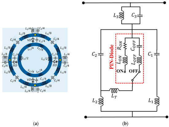 Regarding the passive elements of the structure, the outer ring is modeled as an inductance (), with the gaps on the outer ring represented by a series capacitance (), while the gap and bottom-layer conductor (highlighted by gray rectangles) between the outer rings are modeled as a parallel inductance () and capacitance (). Additionally, the inner ring is modeled as inductance ( and ), while the gap between the rings is represented by a capacitance () in parallel with the PIN-diode. The accuracy of the ECM is validated by comparing the parameters of the simulated R-FSS and the simplified ECM, as shown in Figure 8. The small discrepancy outside the resonance region between the simulated and ECM curves may arise from the limitations of the equivalent circuit method in accurately capturing the complex electromagnetic interactions present in the frequency-selective surface.