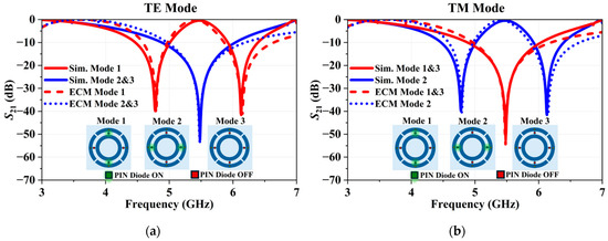 Under TE polarization, Mode 1 exhibits two distinct stopbands: the first band 4.47–4.99 GHz with a resonance frequency of GHz and a fractional bandwidth of 10.89%, and the second band 5.92–6.39 GHz with GHz and a fractional bandwidth of 7.66%. Modes 2 and 3 under TE polarization both exhibit a single wideband characteristic in the range 4.90–6.05 GHz, corresponding to GHz and a fractional bandwidth of 20.91%. For TM polarization, Modes 1 and 3 also present single wideband from 4.90 to 6.05 GHz ( GHz, 20.91% fractional bandwidth), whereas Mode 2 exhibits two stopbands identical to those of Mode 1 under TE polarization, with ranges of 4.47–4.99 GHz ( GHz, 10.89%) and 5.92–6.39 GHz ( GHz, 7.66%). These results demonstrate that the proposed reconfigurable FSS can selectively control the stopband distribution for different modes under TE and TM polarizations, thereby enabling polarization-dependent frequency response and maintaining stable performance across polarization states. The proposed structure has the ability to dynamically switch between two narrow stopbands and a single-wide stopband, as evidenced by the fractional bandwidth values obtained for each operating mode.